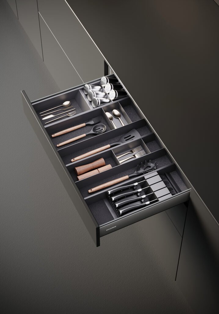 En las cocinas contemporáneas, los sistemas modulares de organización permiten adaptar cada cajón a las necesidades específicas del usuario, lo que convierte el interior del mueble en un espacio flexible y altamente funcional.